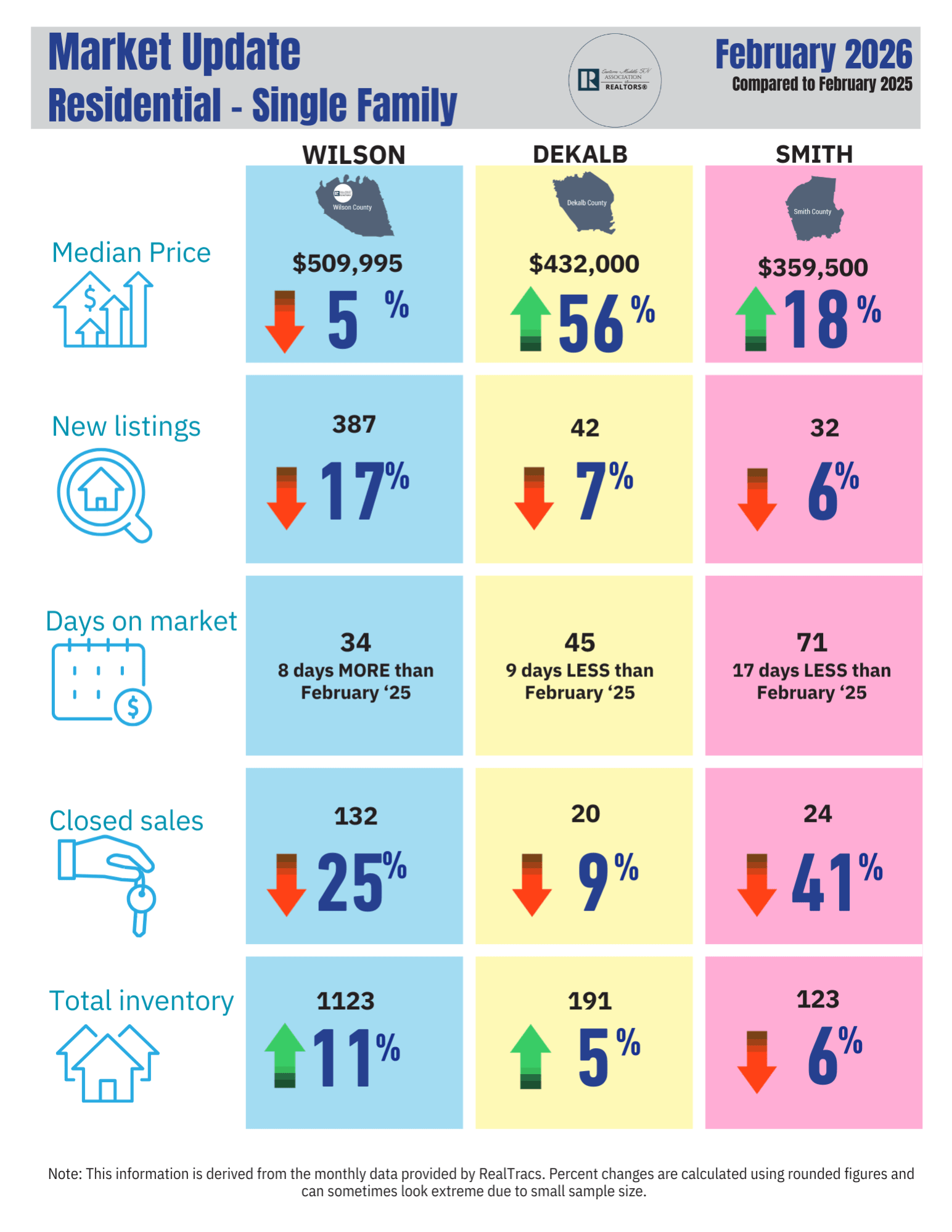 MLS Update Year over Year for February 2026 - all three counties, Smith, Dekalb and Wilson